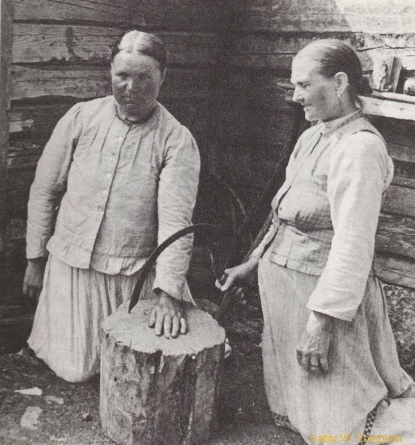 Kipijä naenen laettoi kätensä käskettäessä aetan ovikynnykselle (tai kuvassa pölökylle), ja Toavi (kuvassa sirppiä heiluttava naenen) alkoi hakata hiljalleen kirveellä naesen käen molemmin puolin, ja naenen kysyi vänäjävällä iänellään: mitäs ha--hakk--kaat? - johon Toavi (kummeellae iänellä) vastasi: hakkaan narija! Ja niinhän se olj sekkiin taati parannettu. Mutta vielä tulj paekalle mies, jonka sormi olj palanut. Toavi haki otis kermoo, ja lusikoi sen joukkoon typijä lattiallae olevasta ämpäristäe, ja alako lukkoo loetsuja kumealla iänellään, jonka jälkeen hän voetelj miehen käen valamistamallaan tulenjälenvoeteella. Kun kysyin Toavilta, mistee tämä olj kaiken tämän oppinna, vastasi hän, että muuan Rotikko-Pekka Muaningalta olj kirjottanut aeheesta pienen kirjasen jo 1920-luvulla, ja Vartpurk Vittkenstein olj tehnyt aiheesta laajahkon tutkielman, ja suanna työstääen Suomen Akatemijalta palakinnoksi Vartpurk-pallon, joka myönnetään vuosittaen erittäen onnistuneesta tutkielmasta . Allaoleva valokuva tuasj kuvvoo menneitäe aekoja, eli aekoo jolloin Toavi haki Tukholmasta rokkilevyjäe. Kattokee nyt miestäe: mahto löötyvä levyjäe - aennannii pienempään tarpeeseen - jollei suurempaankin.