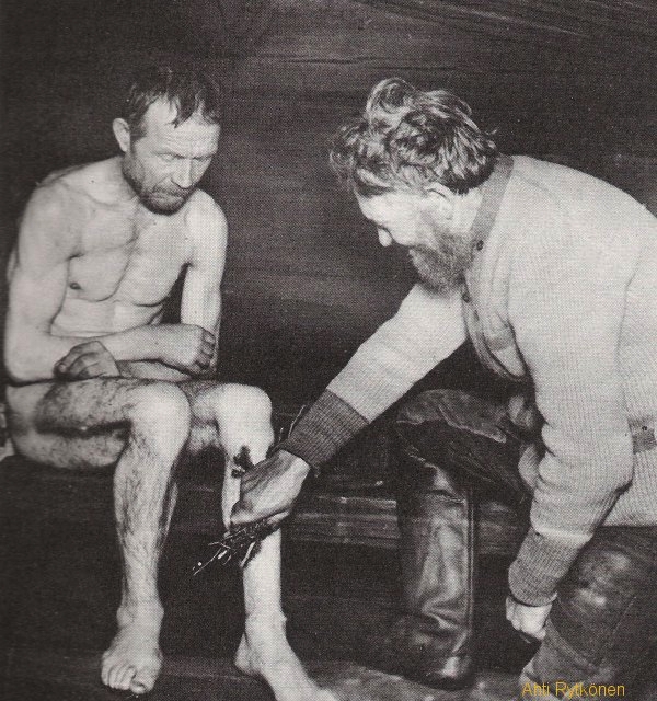 Kun märäntäjäntaatia parrannettiin, ensin lämitettiin (tietennnii) saana. Saanan lämmetessä Toavi mänj läheiselle lähteelle, ja osti sielläe lähevettäe hinkkoommalla hieman kultoo sormuksestaan lähteeseen. Veen hilijalleen lämmetessä Toavi poimi lattijalta joitakin yksikesäesiä pajunvesojae, joita hän alko haatoa veessä, ja joukkoon hän vuolj ruumislauvan lastujahhii. Liemeen laetettiin vieläe kolomelta eri veropiiriltäe kerättyjä kolomikantoja. Sitten Toavi pesj saeraan veellä, ja hinkkasj hänen parkkiintunutta nahkoonsa pajunvesoillae. Kun mies olj hoijettu, paekalle tulj tanakahko naenen, joka tuasj saerasti jännetupin tulehustae. Tapa, jollae tämä taati parannettiin, näkkyy allaolevastae kuvastannii, jossa kaksi naesta menneiltä vuosikymmeniltä on polovillaan aetassa parannustapahtuman aekana.